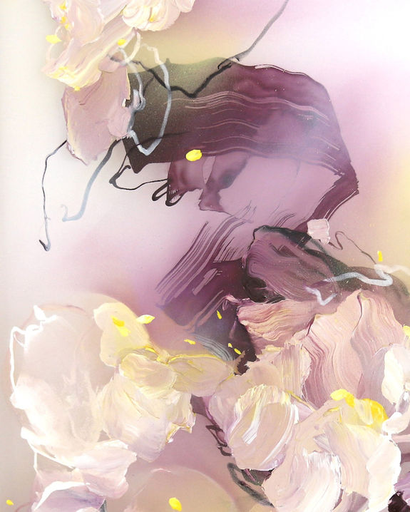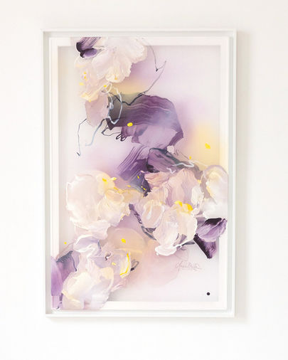 Petal Waltz" is a visual ballet where the pastel purple, like a soft sigh, imbues the composition with a sense of peace and introspection, while the gentle yellow accents add a touch of warmth, reminiscent of sunlight filtering through a garden in bloom.