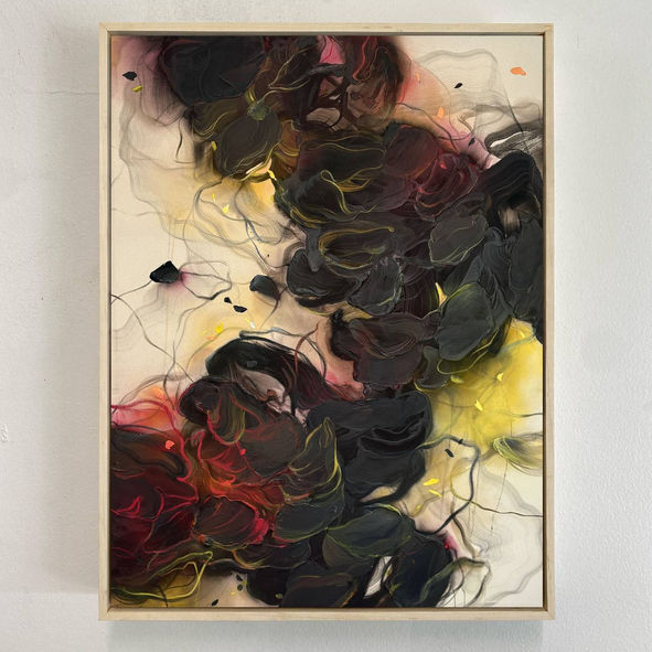 Dark Bloom carries the intensity of a storm in bloom — dark, layered petals ripple with deep crimson, ember-like yellows, and traces of glowing orange. The swirling lines create a sense of restless movement, as if the flowers are caught in a surge of wind and firelight. It’s a painting that feels both powerful and alive, where shadow and flame intertwine in a vivid dance.