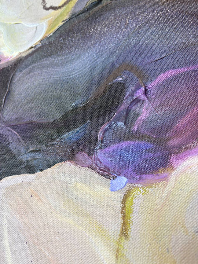 Elysine is an ode to quiet strength — a moment suspended between stillness and bloom. The composition unfolds like light through silk, where ivory petals dissolve into deep violet shadows, tracing the rhythm of transformation.