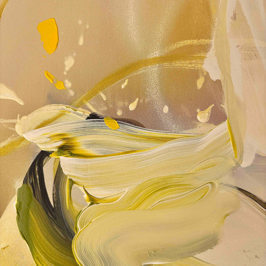 This painting feels like the very first light of day — soft, golden, and full of quiet hope. The pale petals unfold slowly, like a breath, touched by drops of yellow and green that bring it to life.