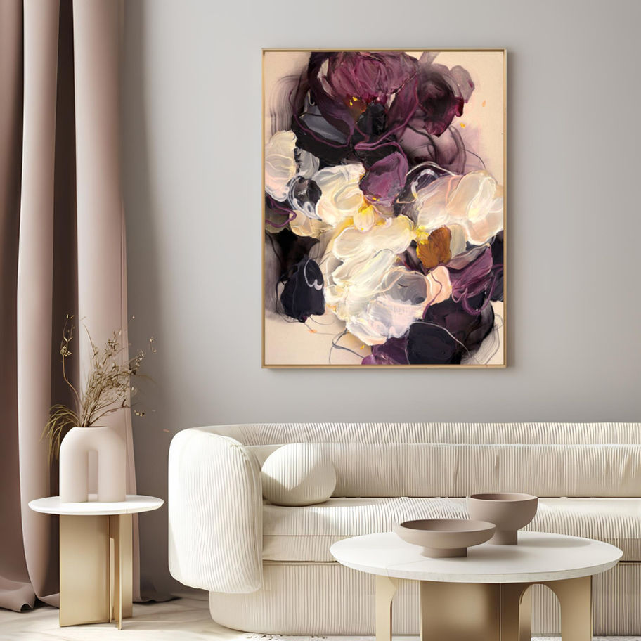 Resilience is a visual meditation on the power of renewal. Bold, textured strokes flow between deep plum tones and soft ivory hues, creating a dialogue between shadow and light.