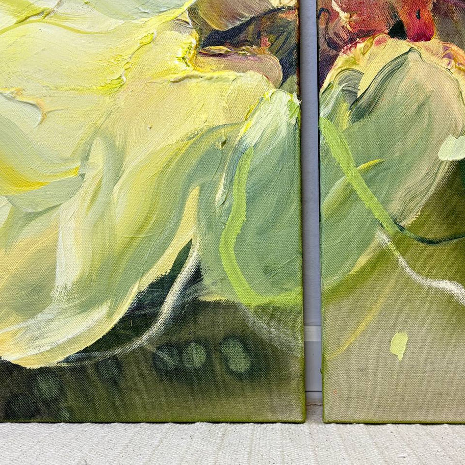 The diptych breathes in motion: golden petals twist into green shadows, bursting with vitality and instinct. The brushstrokes are untamed, almost alive, echoing the raw pulse of growth.