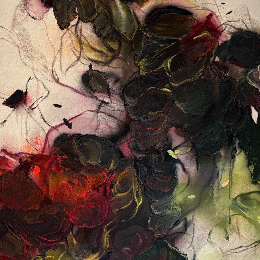 Winter’s dark blooms cascade with texture, creating a dramatic pause as energy dissolves into quiet reflection.